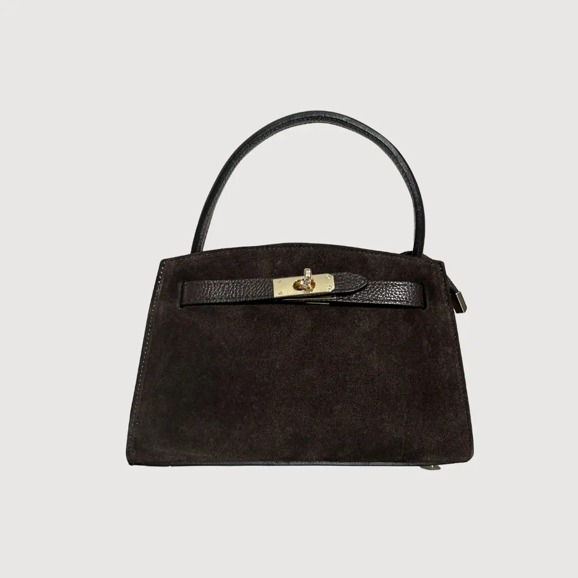 Złote wykończenia, w tym efektowny frontowy zamek obrotowy, dodają całości luksusowego charakteru, a perfekcyjne szycia potwierdzają kunszt rzemieślniczy.
